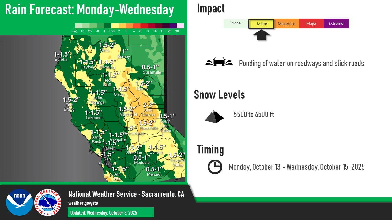 The National Weather Service (NWS) forecast calls for several inches of mountain snow around 5,000 to 6,500 feet and 1 to 2 inches of valley rain Monday, October 13 through Wednesday, October 15. There is still a bit of uncertainty with the exact track and timing of the storm but it serves as a reminder that motorists should start preparing for the changing weather pattern.
