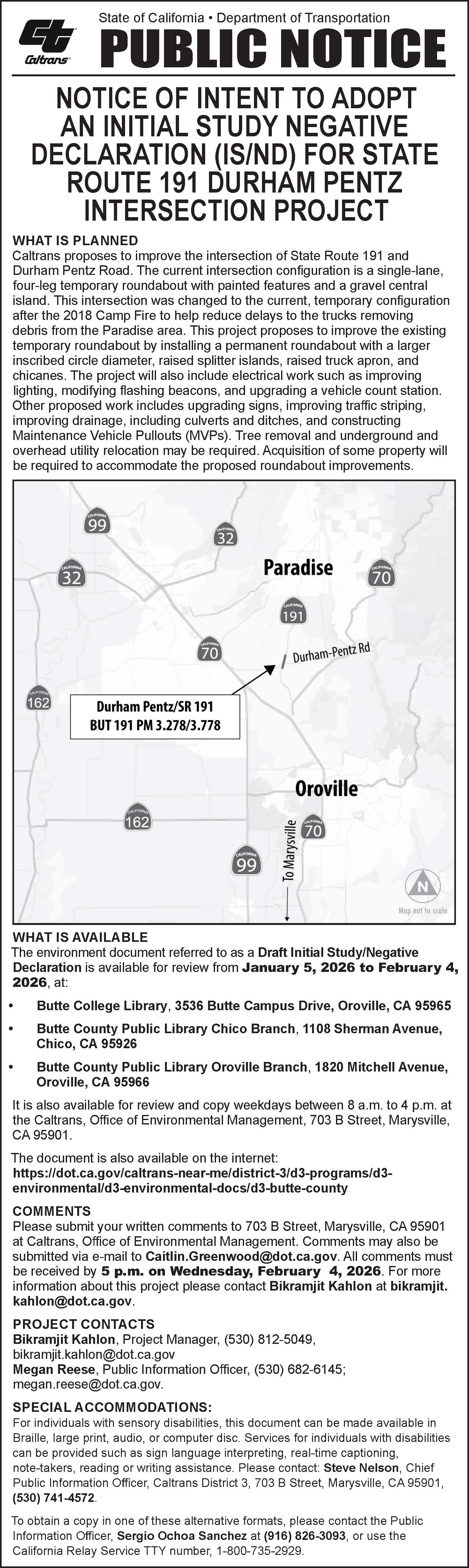 Public Notice: NOTICE OF INTENT TO ADOPT AN INITIAL STUDY NEGATIVE DECLARATION (IS/ND) FOR STATE ROUTE 191 DURHAM PENTZ INTERSECTION PROJECT - Comment Period Closes Wednesday February 4, 2026.