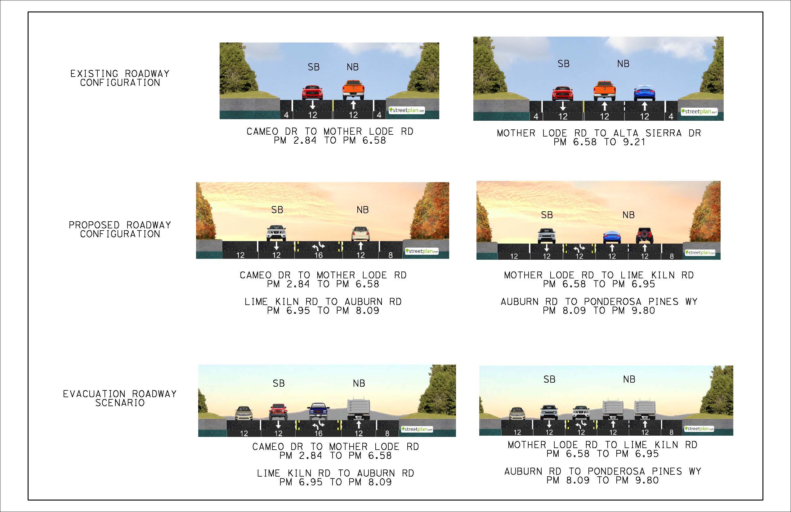 The purpose of this project is to address existing evacuation barriers identified at bottleneck locations along an eight-mile stretch of SR-49 within Nevada County. This project will widen the existing shoulders and create a two-way left turn lane to enhance traffic flow during emergencies. The project also aims to improve mobility, safety, equity, and climate resiliency.