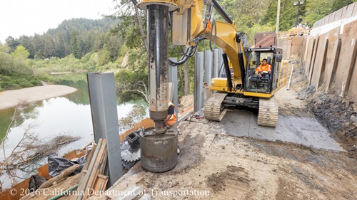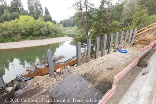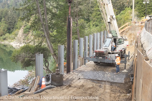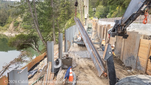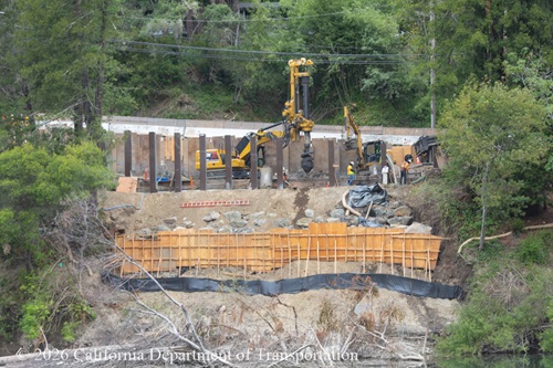 After about a week of wet weather postponed work in late February, Caltrans and the contractor are once again making very good progress on the slide repair. Compare the picture in the February 5 photo to the current photos and you can see that the river has risen because of recent rain. At the bottom of the first photo you can see the silt fence that the contractor built to prevent sediment from leeching into the river.