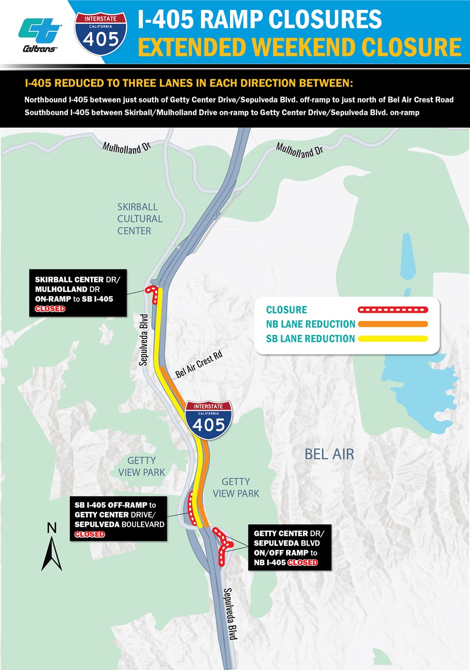 Los Angeles — Caltrans announces extended weekend lane reductions along Interstate 405 (I-405) through the Sepulveda Pass. The freeway will be reduced to three lanes in each direction and motorists are strongly encouraged to seek alternate routes and explore public transportation options to reach their destinations.