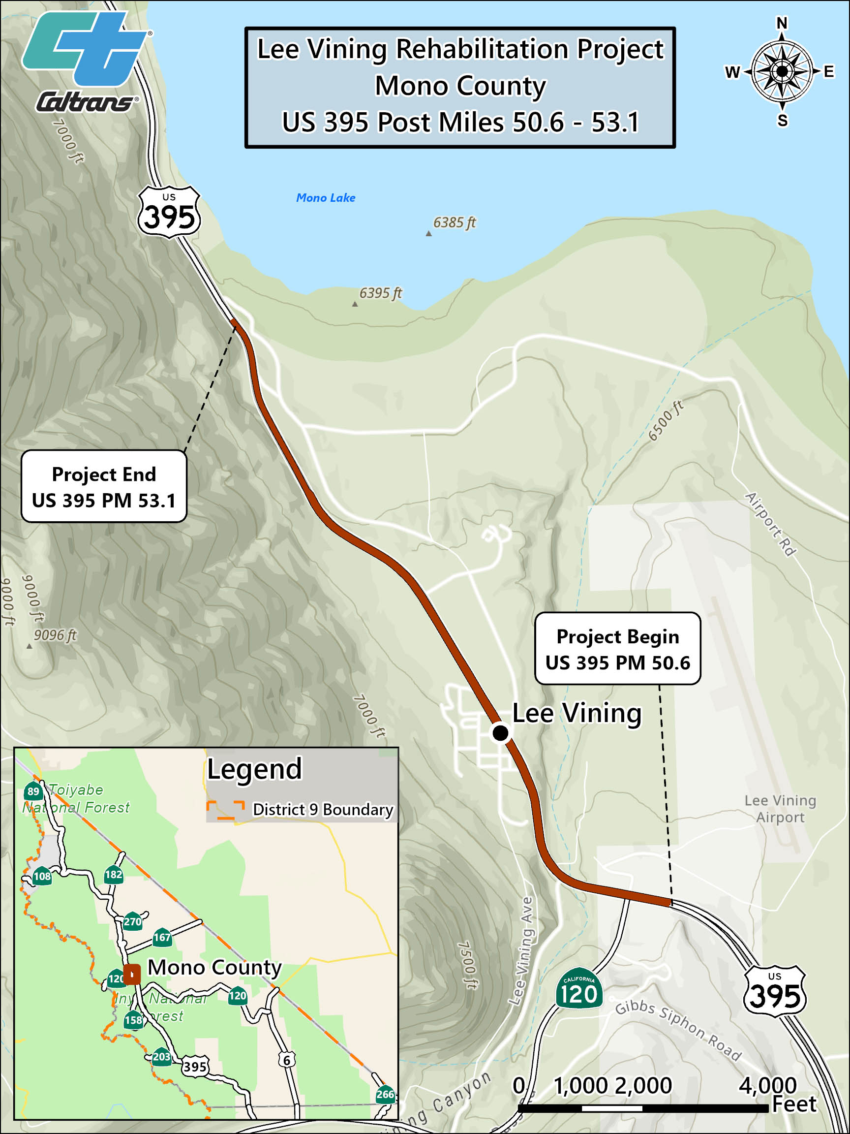 The Lee Vining Pavement Rehabilitation Project is a large-scale reconstruction and redesign of U.S. 395 through Lee Vining that will change the look of the highway for years to come. The project area spans roughly 2.5 miles from just south of the junction with State Route 120 W to Picnic Grounds Road. Project features include: