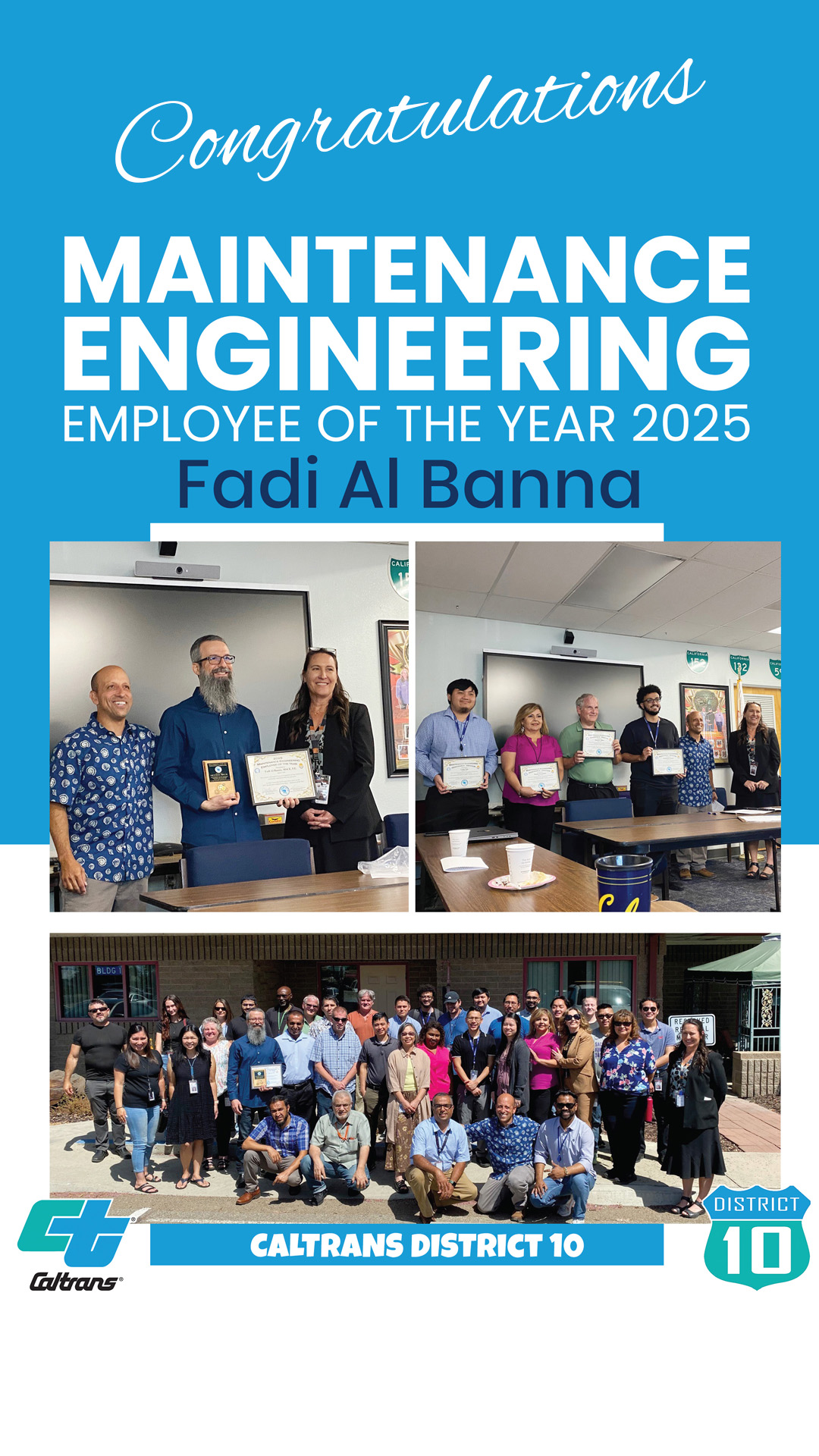 The recognition came just weeks after Fadi left District 10 for a position at Caltrans Headquarters in Sacramento, another rung up the ladder for an amazing person who has served as a gleaming example of employee excellence.