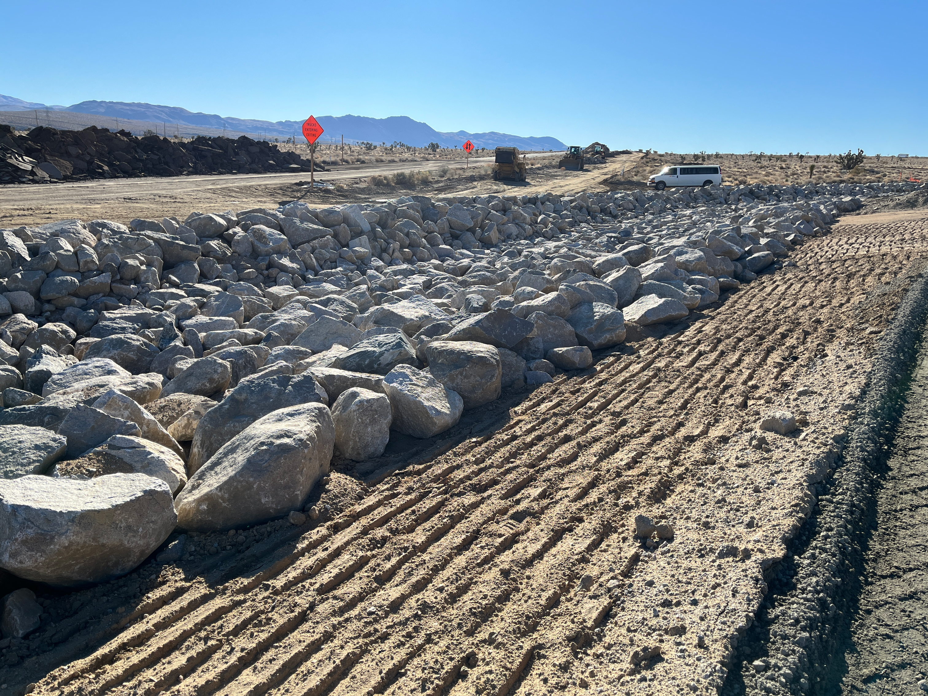To break up the rocky ground, District 10 bulldozers equipped with long, sharp ripper shanks pierced the soil, loosening up the soil and large granite stones and boulders, some of which included evidence of Native American culture such as grinding stones spotted by Native American cultural monitors stationed throughout the construction site. These stones were gently wrapped up to be transported to other parts of the project or donated to the local Native American tribes.