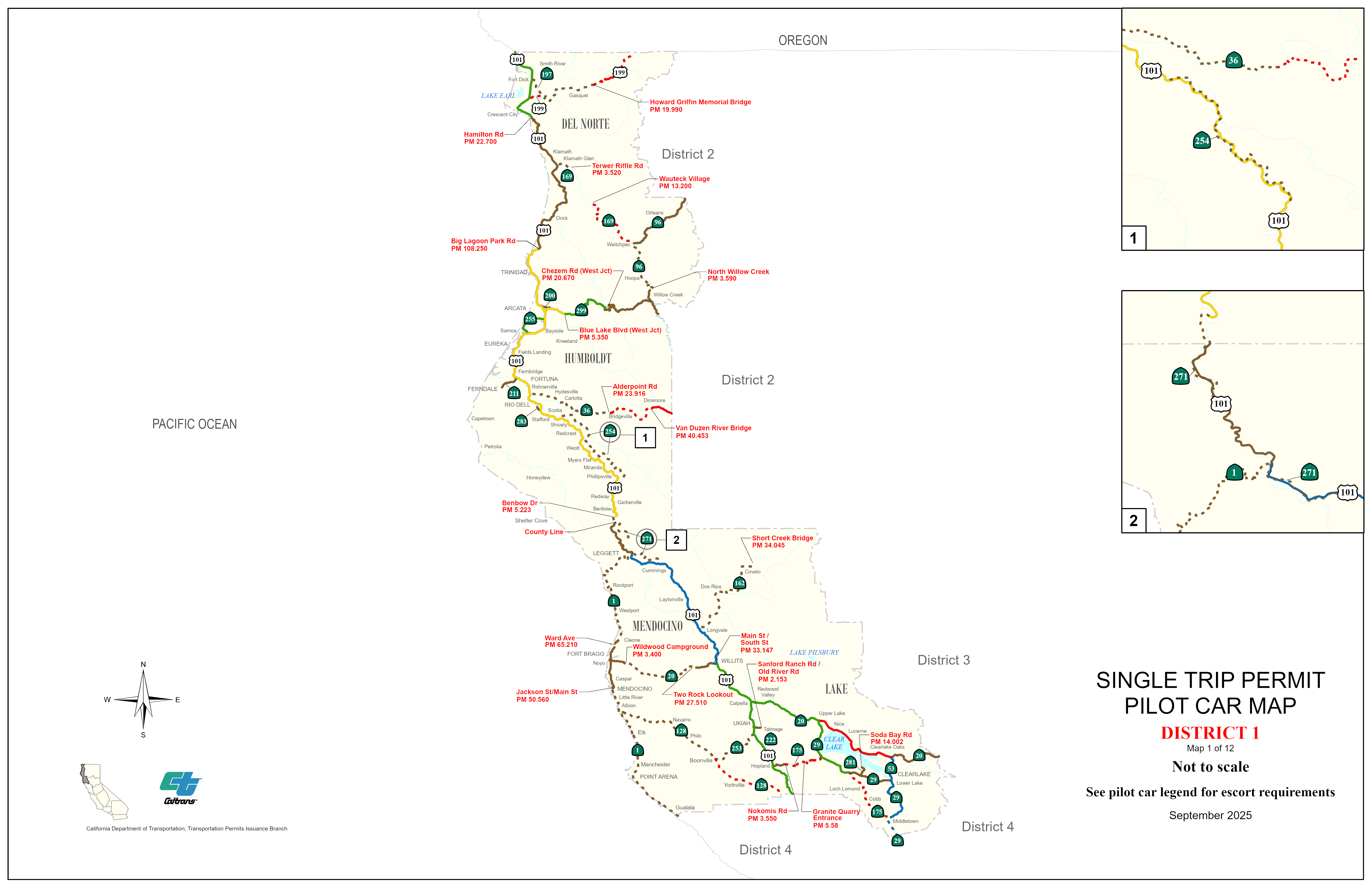 The single trip pilot car maps serve as a visual guide for determining how many pilot cars are required for a given oversized load when traveling on a California state highway. The maps are separated by Caltrans district, starting with District 1 and ending with District 12. Pilot car requirements vary by route and are represented in five distinct colors (from least to most restrictive): yellow, green, blue, brown, and red. The legend provides further information on whether one or two pilot cars are required when specific load dimensions are met.